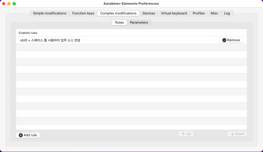 Karabiner - Complex modifications 목록에 추가한 rule 을 등록하는 방법은 다음과 같다.