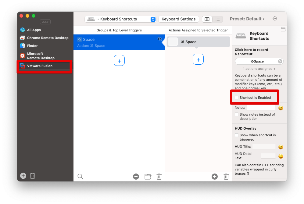작업용 호스트 macOS 에서 한영전환 단축키로 Shift + Space 를 사용하기 위해서 BTT 를 설치하고, 설정을 한 것처럼 VMware 로 구동하는 게스트 macOS 에도 BTT 를 설치하고 설정해도 된다.