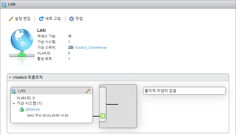 pfsense 가상 시스템이 LAN 과 WAN 모두에 등록되어 있는 것을 확인할 수가 있네.