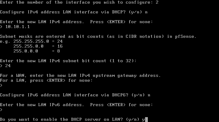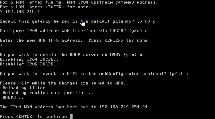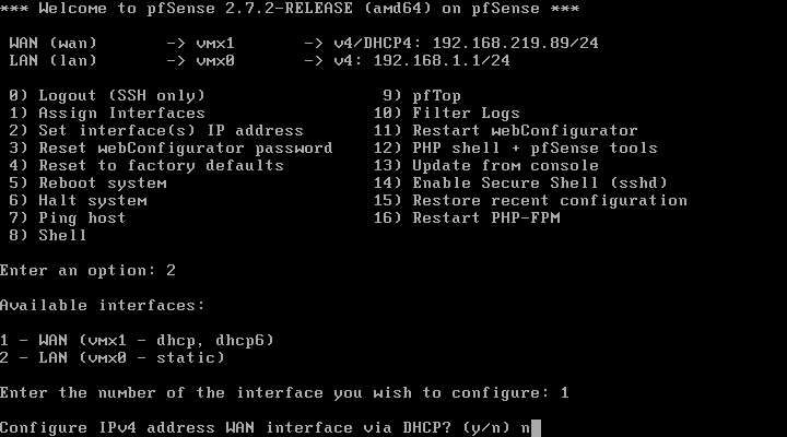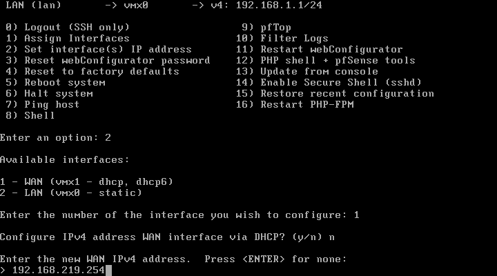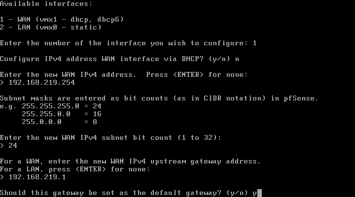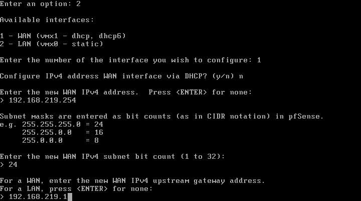 WAN 은 외부에서 접근해야 하는 인터페이스이기 때문에 DHCP 보다는 Static 으로 고정시키는게 좋을 것이고, LAN 은 내부 VM 들에 대한 네트워크 영역대이므로 내가 사용하기 쉬운 영역을 고르는게 무엇보다 중요할 것 같거든.
