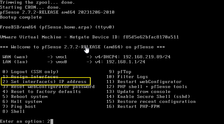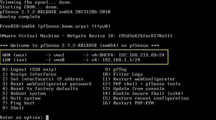 vmx1 의 MAC Address 와 WAN 의 MAC Address 가 일치하니 WAN 인터페이스로 사용할 것의 이름은 vmx1 이 되겠네.