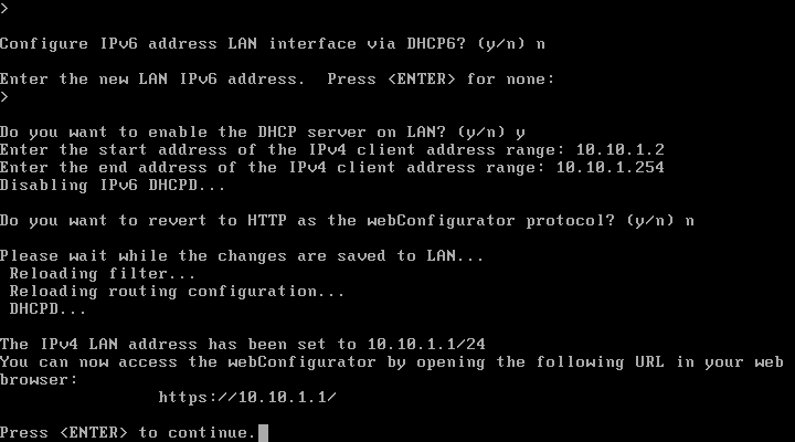 설정값이 적용되어 확인시켜주는군. 웹 브라우저로 https://10.10.1.1 에 접속하면 pfSense Web UI 를 볼 수 있을거래.