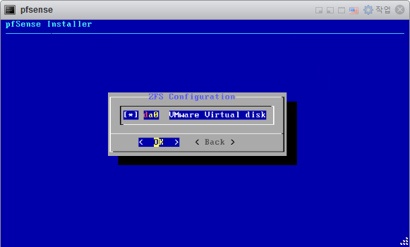 pfSense 설치 대상 디스크를 선택하면 되는데, da0 이 * 로 선택되어 있지 않다면 <Space>를 눌러서 * 가 표시되게 하면 된다. 그리고나서 <Enter>!