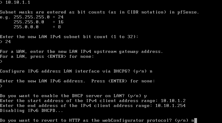 pfSense 는 Web UI 를 제공하는데, 이 Web UI 접근시 HTTP 프로토콜로 접속되게 변경할 것인지를 물어보는건데, HTTPS 를 사용하도록 설정할 것이니 n 이라고 답하면 돼.