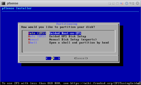디스크 파티셔닝은 초기값인 Auto (ZFS) 그대로 <OK>! 만약 ZFS 와 UFS 에 대해서 알고 싶다면 아래 링크를 참고하자.