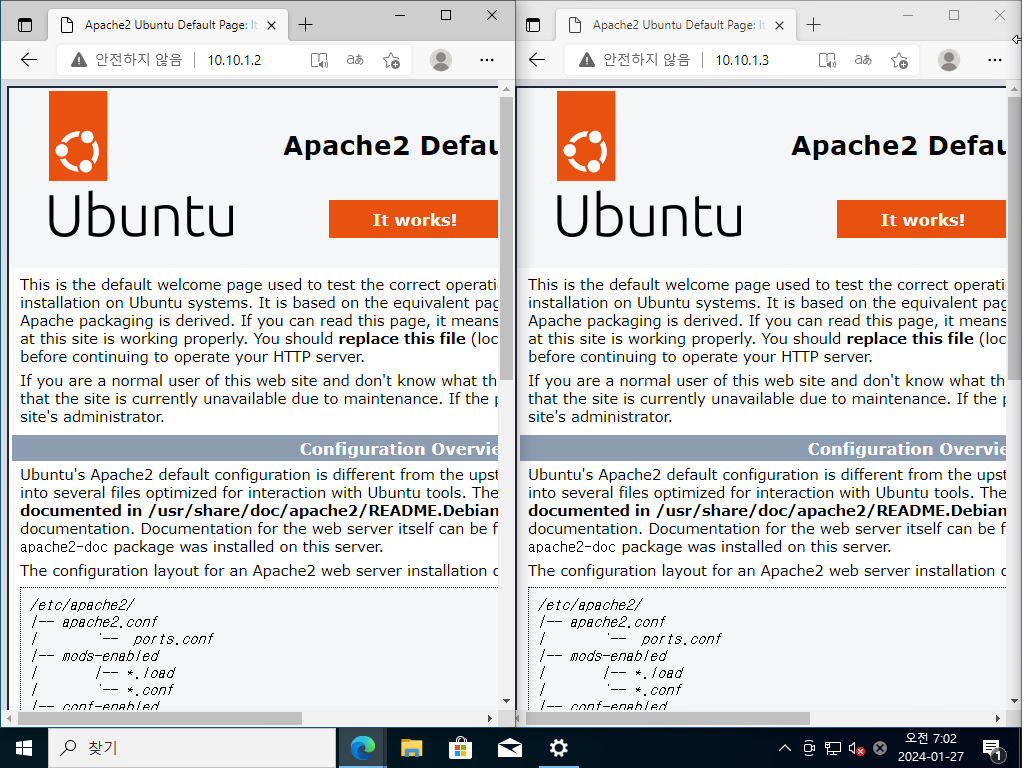 내부망에 접속 테스트를 위해서 설치한 윈도우OS 의 manage.win 가상 시스템에서 10.10.1.2 와 10.10.1.3 에 각각 접속해본 결과 아파치 디폴트 페이지가 정상적으로 로드되고 있는 것을 확인할 수 있지.