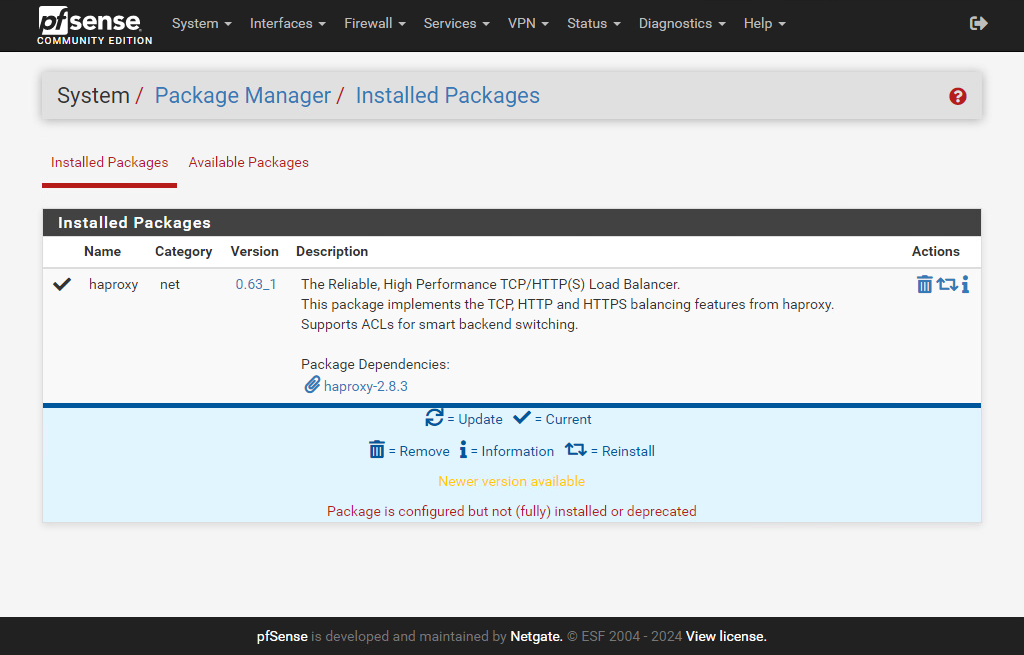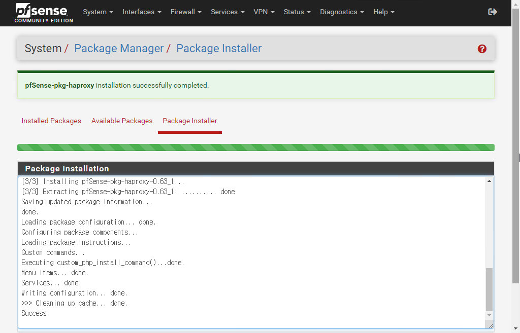 설치 작업이 Success 인 것을 확인한 상태에서 다시 Installed Package 탭 화면으로 이동해보면 설치된 haproxy 패키지 항목을 볼 수 있을거야.