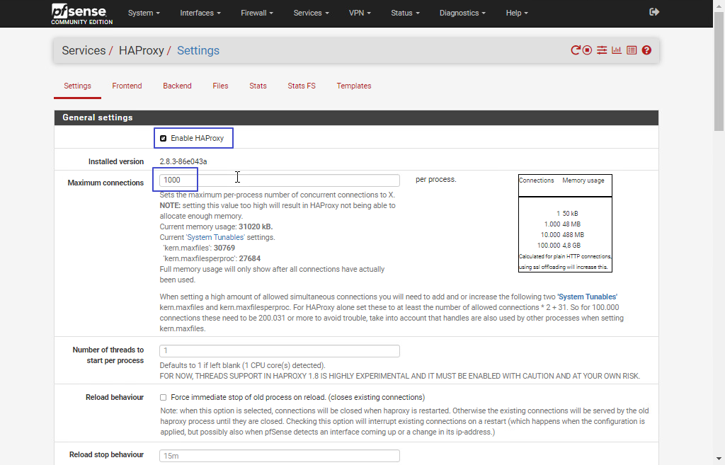 마지막으로 Service / HAProxy / Settings 화면에서 Enable HAProxy 를 체크해주고, Maximum connections 에 1000 을 입력한 뒤 저장해주면 HAProxy 설정은 완료되는거야.