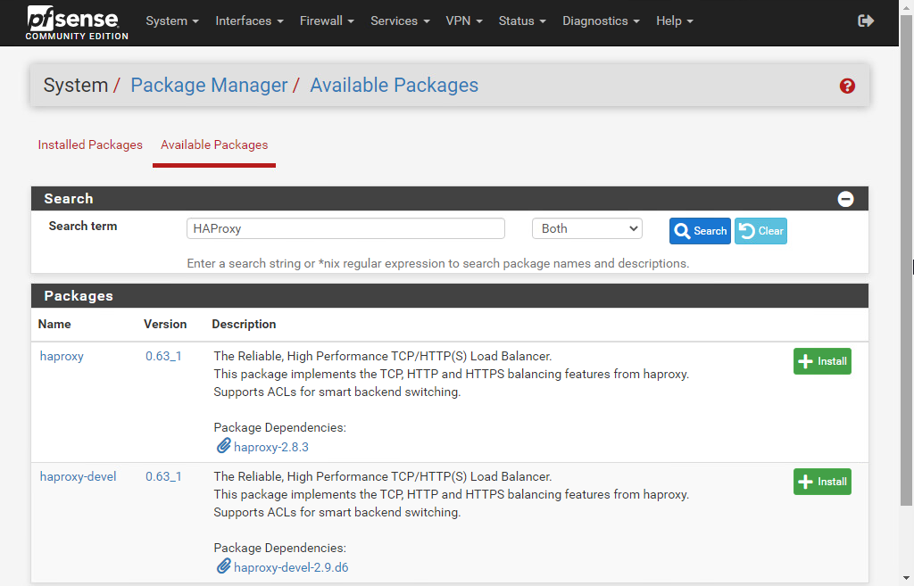 검색어에 HAProxy 를 입력하고 “Search” 버튼을 클릭하면 2개의 패키지가 결과로 표시되는데, 첫번째 항목 haproxy 의 오른쪽 Install 버튼을 눌러서 설치해보자.