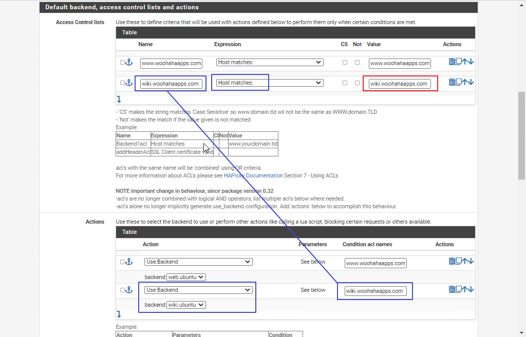 마찬가지로 선으로 이어진 항목의 이름은 동일하게 입력되어야 하고, 빨간색 사각형 안의 값이 처리해야 할 도메인 주소값 wiki.woohahaapps.com 이고, 이 도메인 주소값이 들어왔을 때 wiki.ubuntu 라는 이름의 Backend 항목이 처리되도록 설정한 결과야.