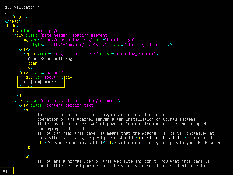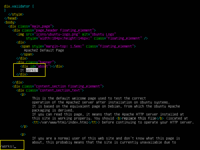 vi 에디터에서 index.html 파일이 열리면 / 를 누르고 works! 를 입력하고 엔터를 치면 index.html 파일에서 해당 단어가 있는 위치로 이동하거든.