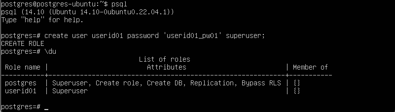 postgres=# create user userid01 password 'userid01_pw01' superuser;
