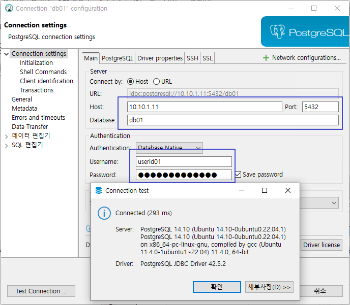 DB명과 사용자계정은 우분투 22.04 에 PostgreSQL 설치하기 포스트에서 생성한 정보를 활용했어.