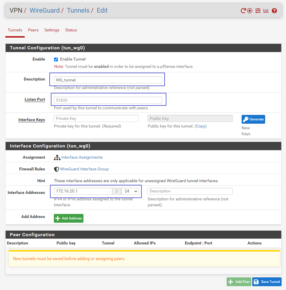 터널의 설명으로 WG_tunnel, 포트값은 디폴트값인 51820을 그대로 두고(보안을 생각한다면 디폴트값을 그대로 사용하지 말고 수정해주는게 좋아), 터널 IP 주소로 172.16.20.1/24 를 할당했어. 이 터널 주소는 공인 IP 주소가 아닌 사설 IP 주소중에서 마음에 드는 대역대로 선택해주면 되겠어.