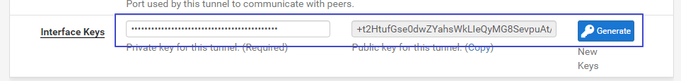 오른쪽 파란색의 Generate 버튼을 클릭하면 Interface Keys 의 Private Key 와 Public Key 가 발급되어 채워지지.