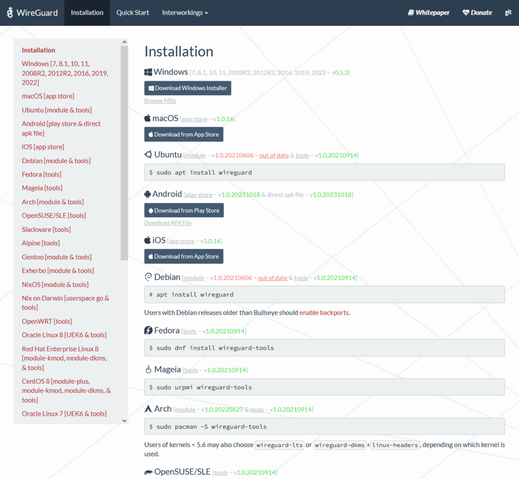 https://www.wireguard.com/install/ 주소로 이동하면 OS 별로 WireGuard 클라이언트 프로그램 목록이 정리되어 있지.