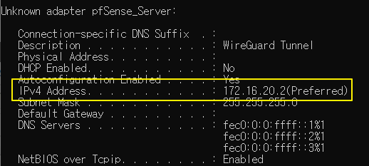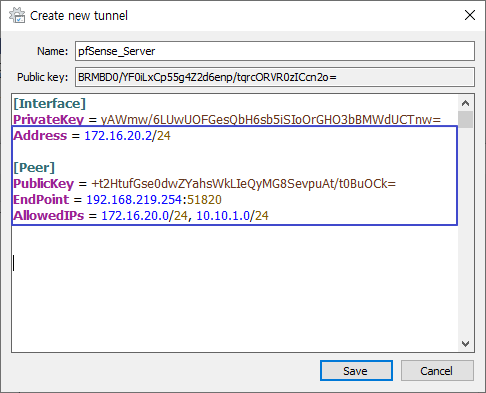 AllowedIPs 값으로는 이 VPN 클라이언트가 접속 가능한 IP 주소 대역 목록을 콤마(,) 로 연결해서 기록해주면 되는데, VPN IP 주소 대역(172.16.20.0/24) 은 당연히 포함되어야겠고, 10.10.1.0/24 는 pfSense 의 내부 네트워크(LAN) 영역에 할당한 IP 주소 대역인데, VPN 으로 연결해서 LAN 네트워크에 구성되어 있는 서버에 접속할 수 있게 하기 위한 목적이지.