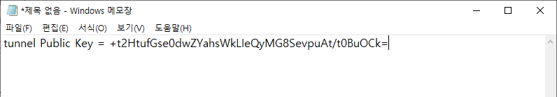 [Peer] 섹션의 PublicKey 에는 아까 메모장에 잠시 기록해 두었던 VPN 터널의 PublicKey 값을 입력해주면 돼.