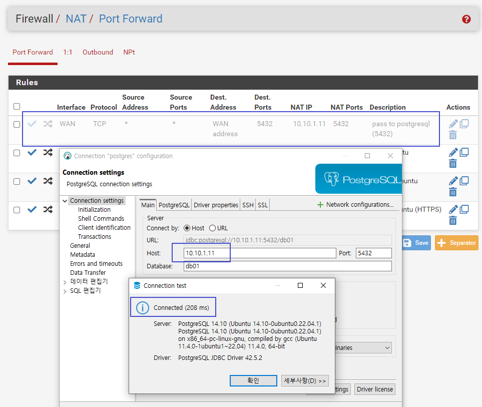 DBeaver 에서 PostgreSQL 서버 접속 설정값을 조금 변경해야 할 필요가 있는데, 5432 포트 포워딩 규칙을 활성화했을 때에는 DB 서버 주소를 192.168.219.254 로 pfSense 서버 주소를 지정했었잖아? 그런데, VPN 으로 연결하는 경우에는 내부 LAN 영역에 있는것과 같은 개념이니, postgres-ubuntu 서버의 주소인 10.10.1.11 로 변경해 줘야 해.