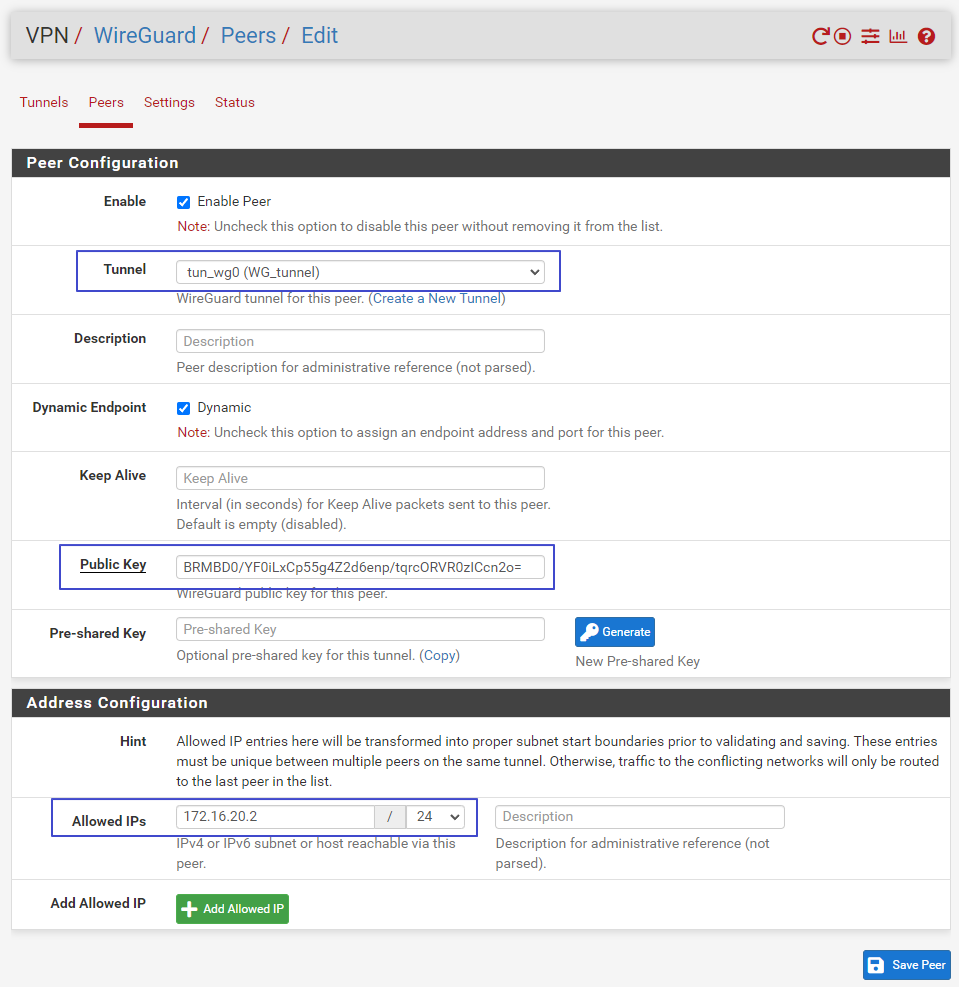 Allowed IPs 에는 클라이언트에게 할당할 IP 주소값을 입력해주는건데, 터널에 할당했던 IP 주소가 172.16.20.1 이니까 그 다음 번호인 172.16.20.2 로 입력해주면 되겠네. Save Peer 저장 버튼 누르는거 잊지마~!