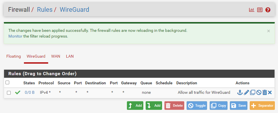 Add 버튼을 눌러서 WireGuard 인터페이스에 대한 방화벽 규칙을 모두 허용으로 추가해 주어야 해.