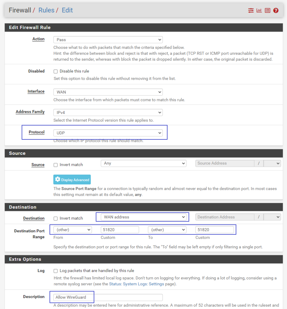 UDP 프로토콜을 처리한다는게 특이점이야. 목적지는 WAN address, 포트범위는 VPN 터널 포트로 설정한 51820 을 선택해주자.