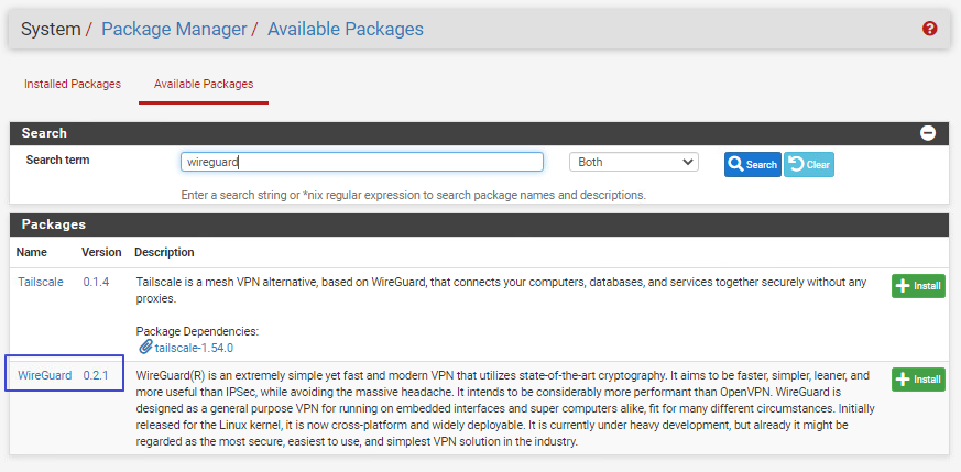 우선 System / Package Manager 화면의 Available Packages 탭으로 이동해서 검색어에 wireguard 라고 입력한 후에 검색을 해보자.