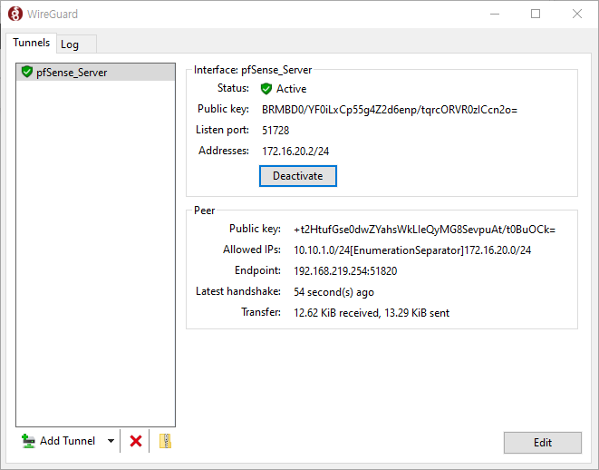 WireGuard VPN Client 에서 Activate 버튼을 클릭하면 터널에 접속할 수 있게 돼.