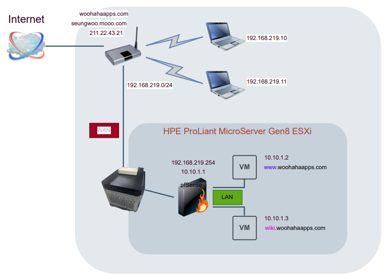 사무실 공유기는 외부 IP 주소로 211.22.43.21 을 할당받은 상태이고, 내부 IP 대역은 192.168.219.0/24 대역으로 설정되어 있는데, 이 중에서 MicroServer 에서 동작하는 pfSense 서버가 할당받은 IP 주소는 192.168.219.254 이고, 공유기의 DMZ 기능으로 외부에서 들어오는 모든 트래픽을 pfSense 가 받을 수 있도록 설정한다면 외부 IP 주소 211.22.43.21 이 곧 192.168.219.254 (pfSense) 가 되고, pfSense 에서 포트포워딩이나 HAProxy 등을 통해서 내부 VM 이 제공하는 서비스가 외부로 연결되는 구조가 완성되는거지.
