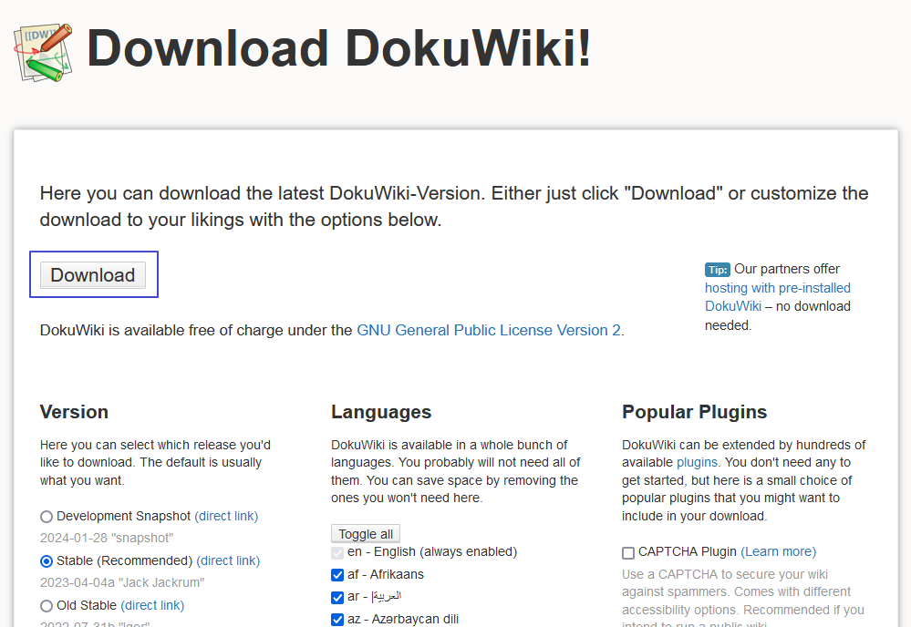https://download.dokuwiki.org/ 주소를 방문하면 dokuwiki 다운로드 링크가 있어.