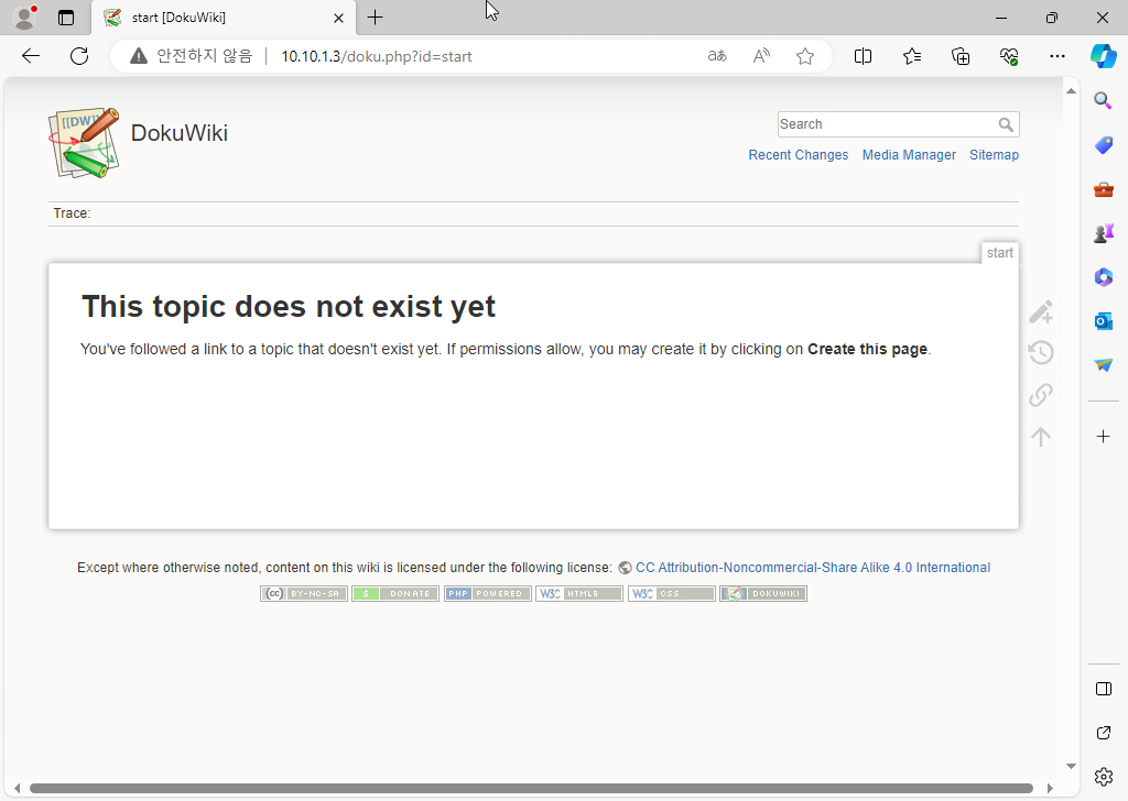 dokuwiki 사이트가 정상적으로 표시되긴 했지만, 아직 설치절차가 마무리되지 않았기 때문에 기능을 사용할 수가 없어.