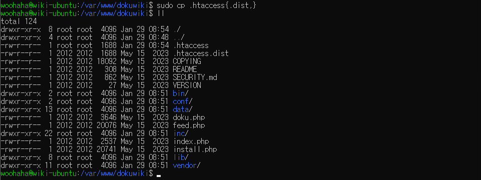 $ sudo cp /var/www/dokuwiki/.htaccess{.dist,}