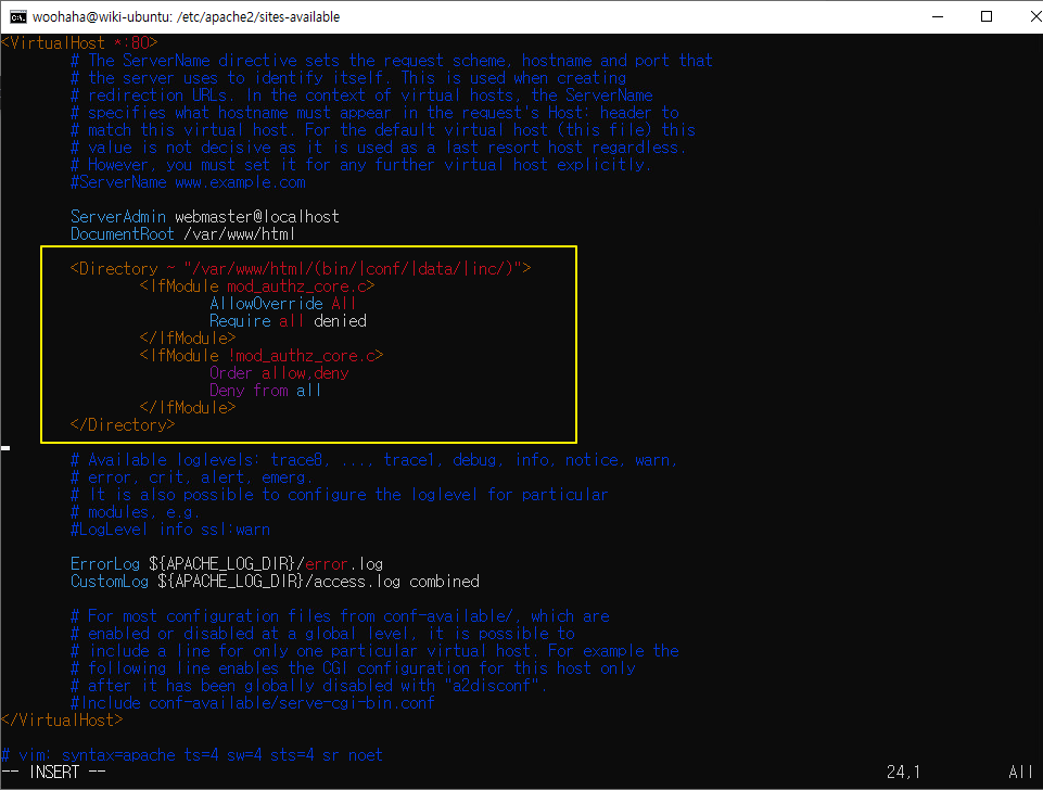 이제 apache 기본 웹 디렉토리의 설정을 수정해볼께.