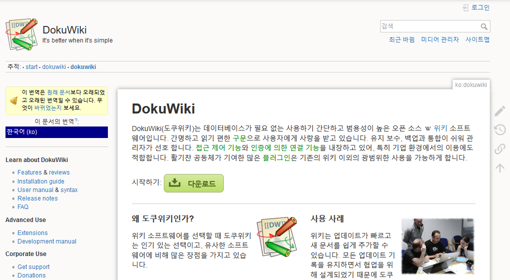 그래서 화려하지는 않으나 데이터베이스를 사용하지 않고, 있을만한 기능이 다 있는 dokuwiki 를 다시 선택하게 되었지.