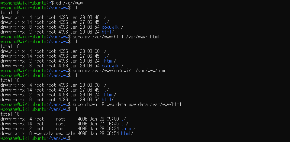 apache2 기본 웹 디렉토리가 /var/www/html 인데 지금 dokuwiki 를 /var/www/dokuwiki 디렉토리에 설치했어. dokuwiki 디렉토리를 html 로 변경해서 기본 웹 경로로 사용되도록 수정해볼께.