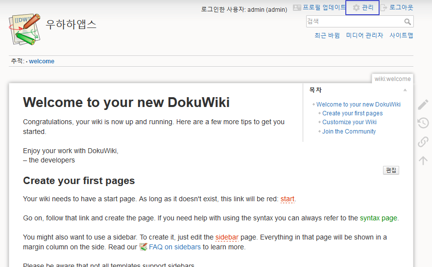 오른쪽 위에 “관리” 링크가 보이지? 그걸 누르면 위키 관리 화면으로 진입하게 되거든.