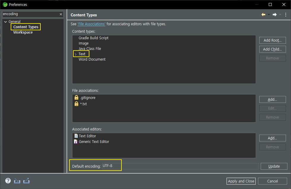 검색어에 encoding 이라고 입력한 후에 Content Type 항목을 선택하고 > Text 를 클릭해줘.