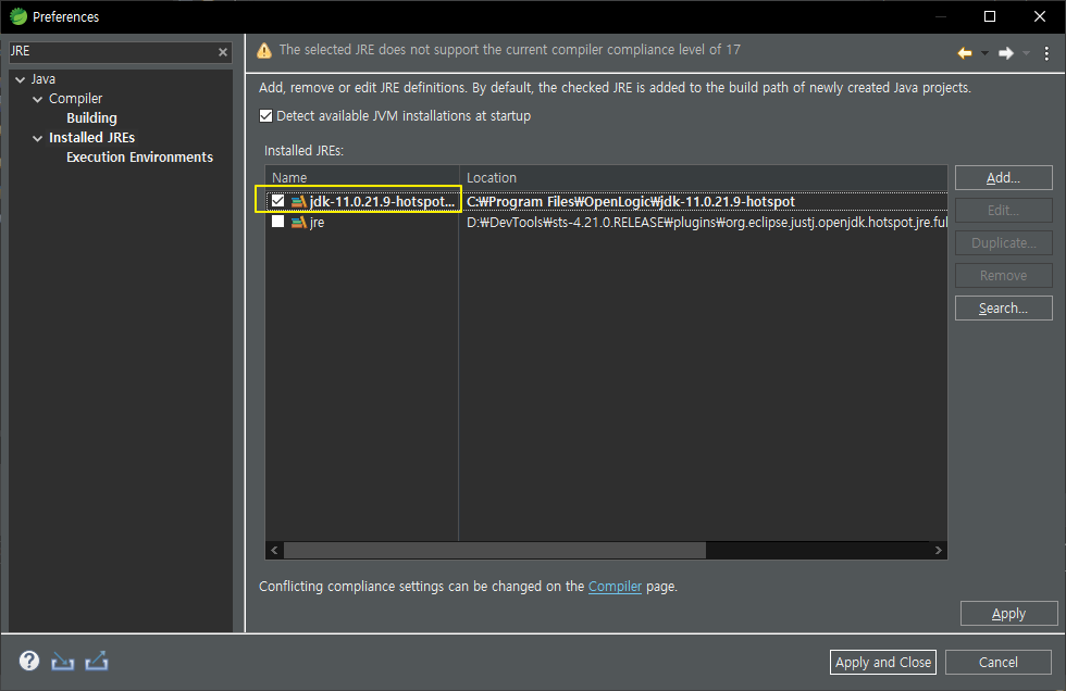 Compiler compliance level (컴파일러 준수 수준) 값을 기본값인 17에서 11로 변경을 할께. JDK를 11 버전으로 설치했으니 이 값 역시 여기에 맞게 설정해 주는 거야.