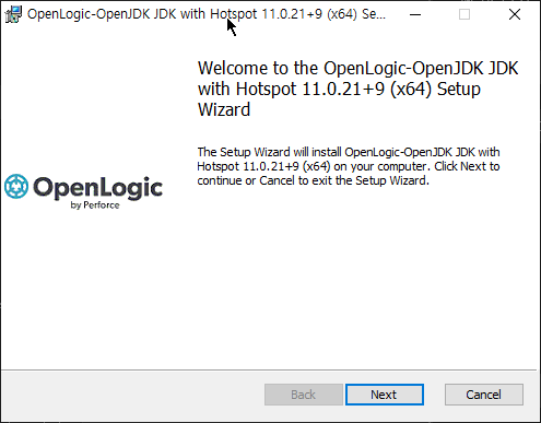 다운로드된 파일의 이름은 openlogic-openjdk-11.0.21+9-windows-x64.msi 이고, 이 파일을 실행시키면 설치작업이 진행되지.