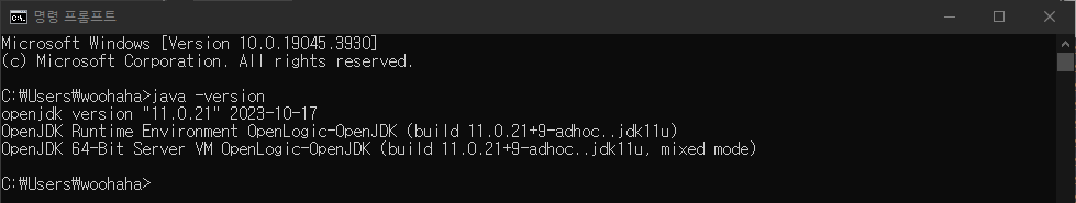 방금 설치한 OpenJDK 의 버전이 정상적으로 표시되는 것을 확인할 수 있을거야(설치 과정에서 PATH 에 추가 뿐만 아니라 JAVA_HOME 변수 설정과 레지스트리 키 덮어쓰기 옵션을 선택해야만 이 결과가 나올 수도 있어).
