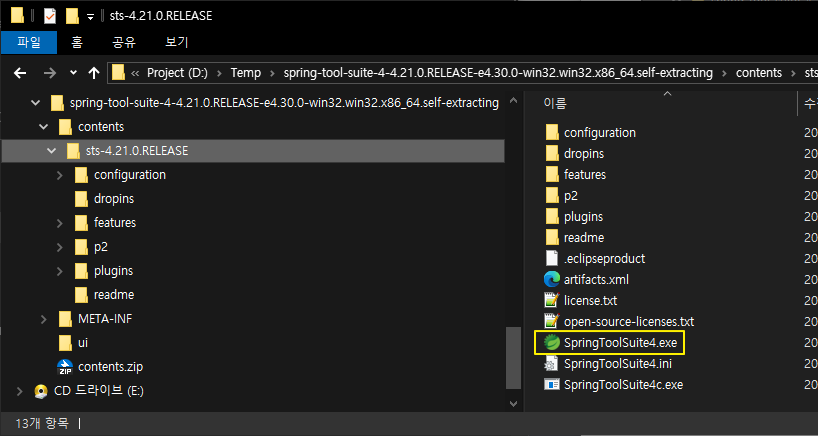 SpringToolSuite4.exe 파일이 들어있는 sts-4.21.0.RELEASE 디렉토리를 적절한 디렉토리로 이동시켜주는게 좋겠어. 나는 D:\DevTools 디렉토리 아래로 이동시켰어.