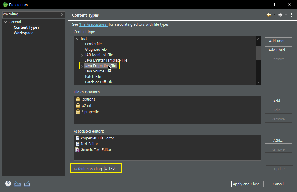 > Text 의 왼쪽 > 부분을 클릭하면 하위 목록이 펼쳐지는데, 이중에서 Java Properties File 항목값은 여전히 ISO-8859-1 값으로 지정되어 있는 것을 확인할 수 있는데, 이 값도 UTF-8 로 수정해주자.