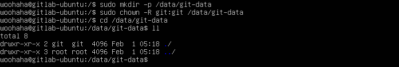 저장소 경로 변경이 제대로 적용되었는지는 root 권한으로 변경한 후에 /data/git-data 경로로 이동해보면 알 수 있어.