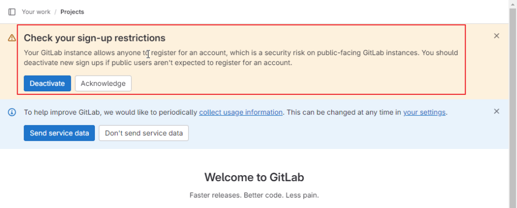 로그인에 성공하면 sign-up 제한설정을 확인하라는 메시지가 표시되지. 기본적으로 누구나 계정 가입을 신청할 수 있는 모드인데, root 권한의 사용자가 이를 확인하고 신규 가입을 비활성화시켜야 한다는 보안 권고를 하는거야.