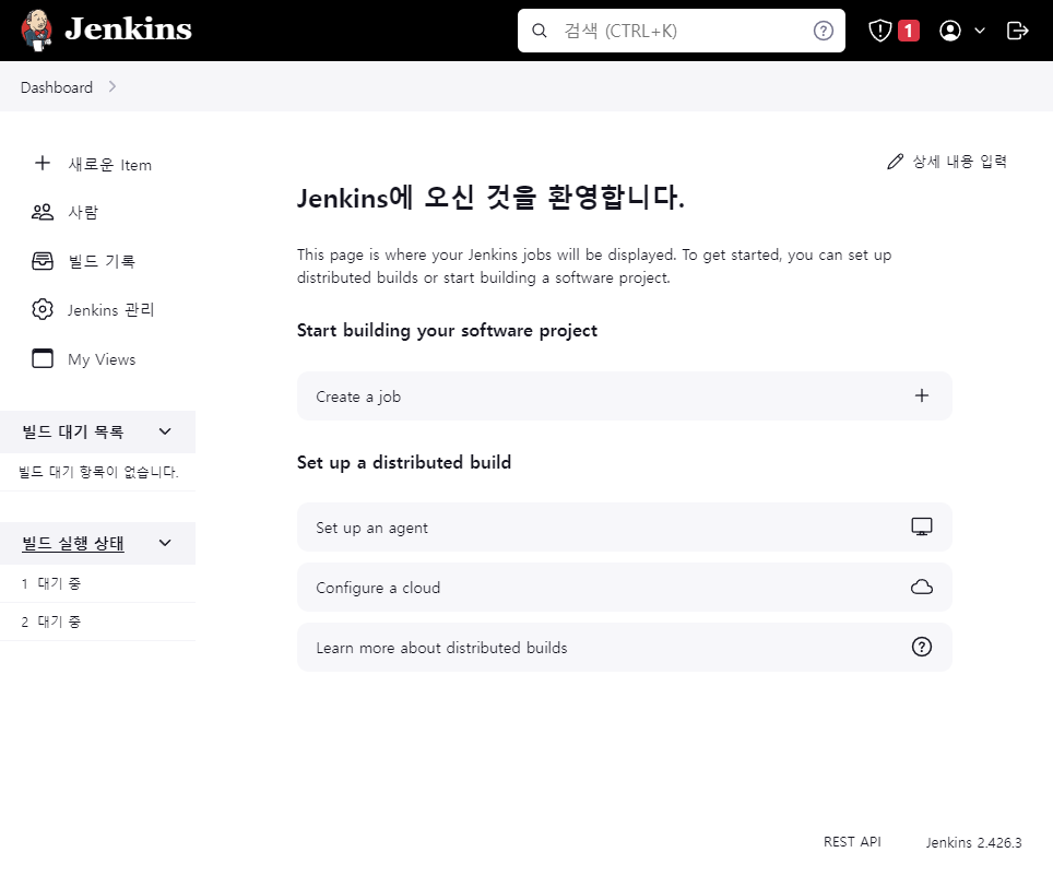 Start using Jenkins 버튼을 클릭하면 관리자계정으로 초기 화면이 표시가 돼.