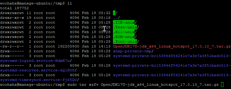 압축이 해제되면 /tmp 디렉토리 아래에 jdk-17.0.10+7 디렉토리가 생성이 되지.