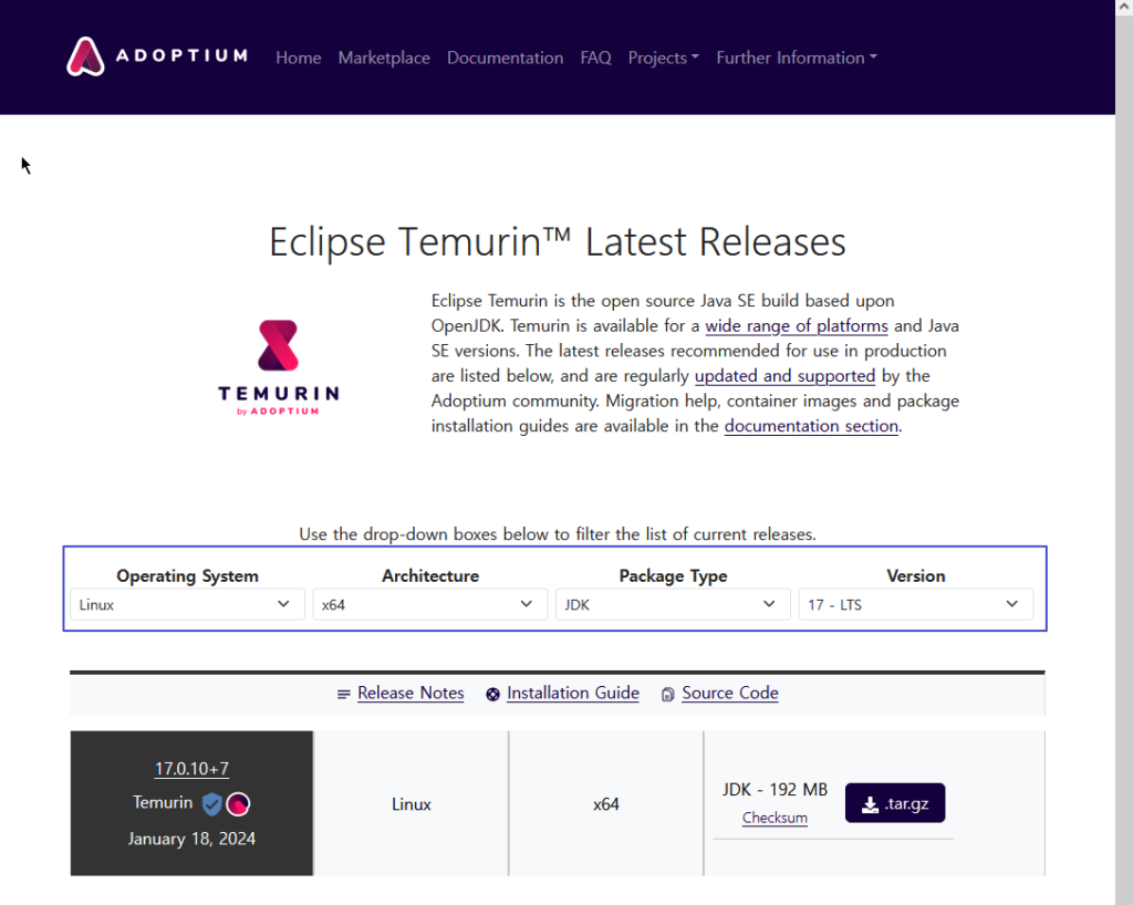$ sudo wget https://github.com/adoptium/temurin17-binaries/releases/download/jdk-17.0.10%2B7/OpenJDK17U-jdk_x64_linux_hotspot_17.0.10_7.tar.gz