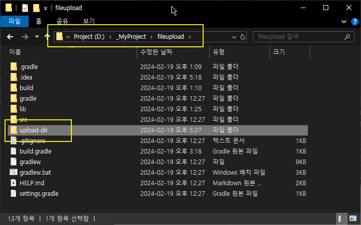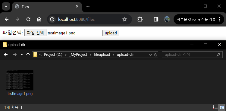 에러를 해결하기 위해서 내가 직접 파일 저장 경로인 D:\_MyProject\fileupload\upload-dir 을 만들고나서 다시 실행시켜볼께.