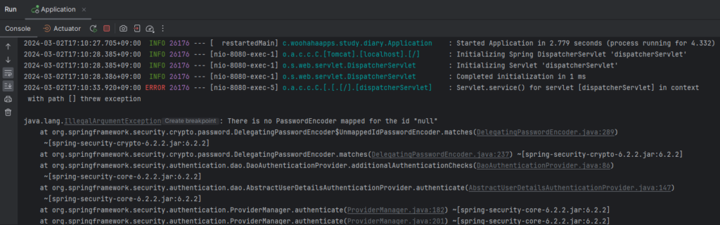 2024-03-02T17:22:51.830+09:00 WARN 5092 --- [nio-8080-exec-6] o.s.s.c.bcrypt.BCryptPasswordEncoder : Encoded password does not look like BCrypt