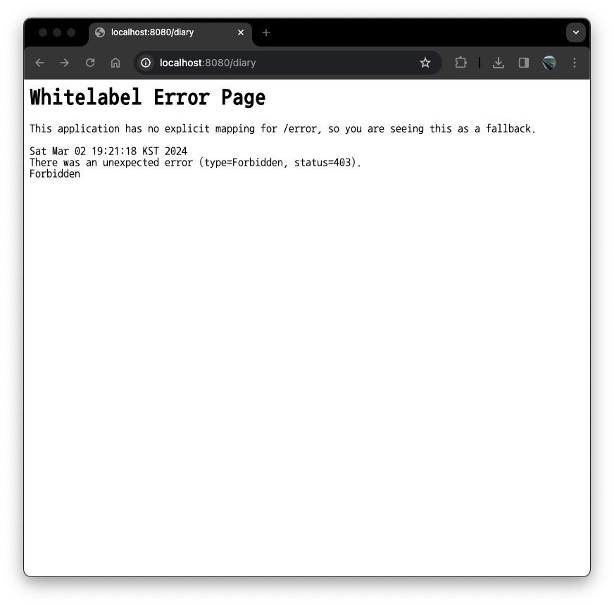 그런데 일기쓰기 화면에서 일기를 작성하고 저장을 누르면 에러 페이지가 표시되었다.